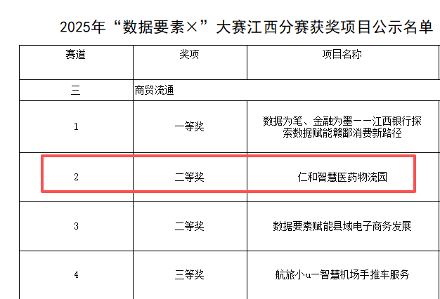 近期,由仁和投资建设运营的智慧医药物流园项目,在2025年“数据要素×”大赛江西分赛区中表现突出,荣获商贸流通赛道省级二等奖。这一荣誉不仅是对仁和在医药流通领域数字化创新实践的高度认可,也充分展现了企业在深化供应链智能化升级、激活数据要素价值方面的领先探索。